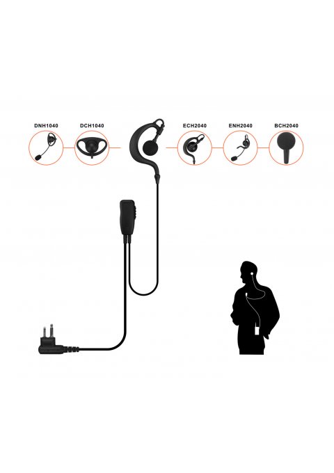 Zestaw dwuczęściowy, wyposażony w przycisk PTT z mikrofonem oraz słuchawką nauszną typu "D-Shell". Przewody w otulinie PVC wzmocnione kevlarem.